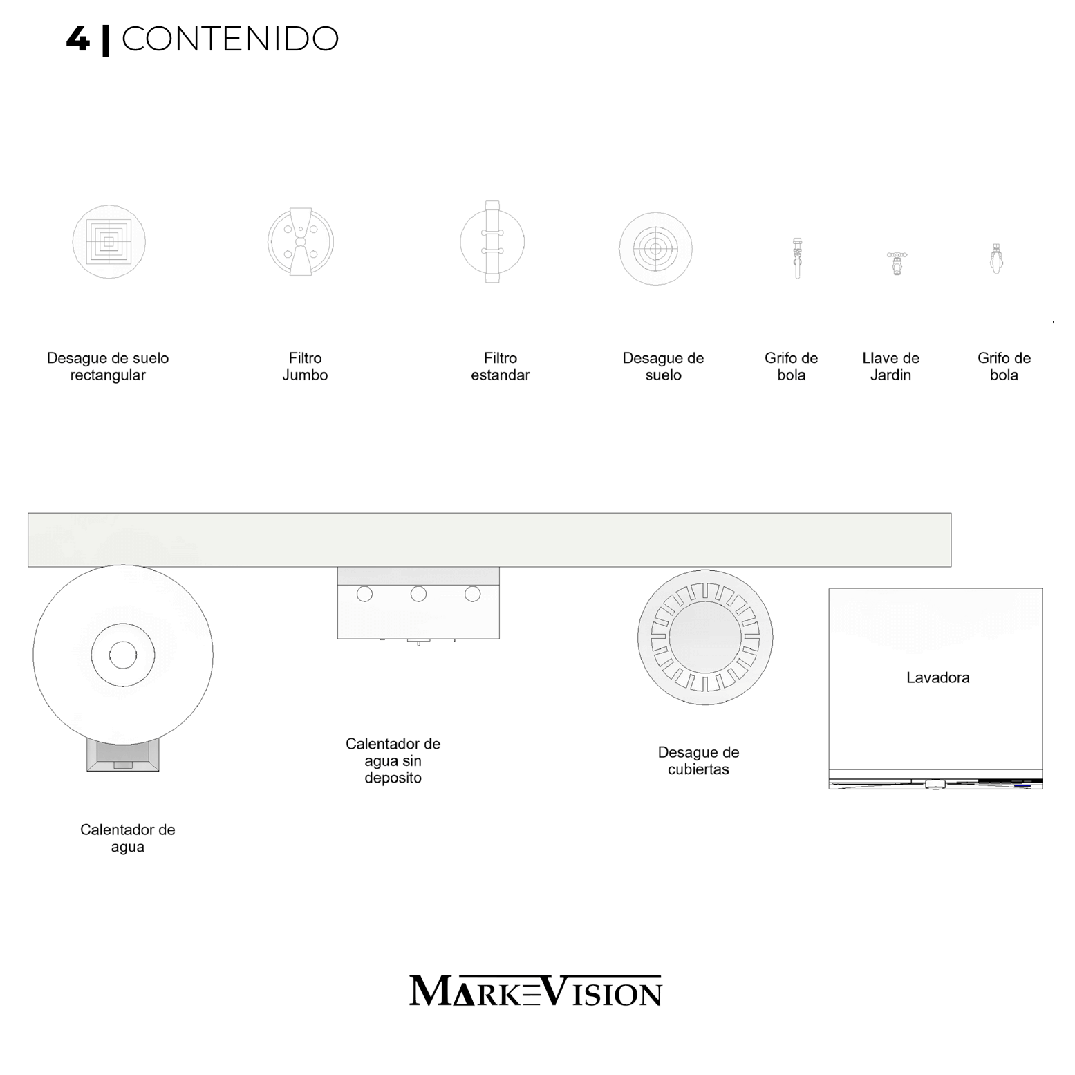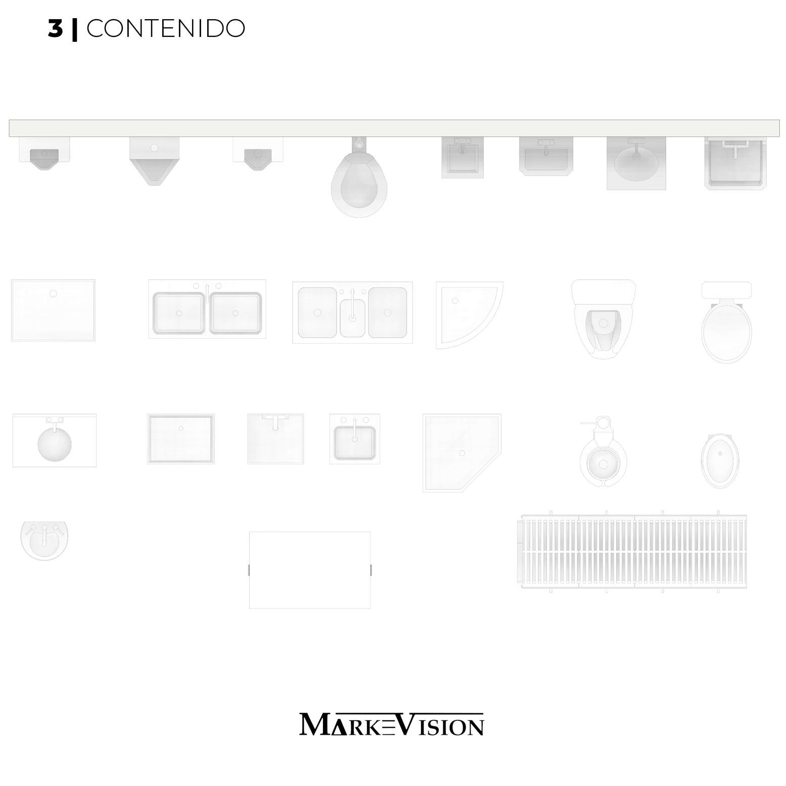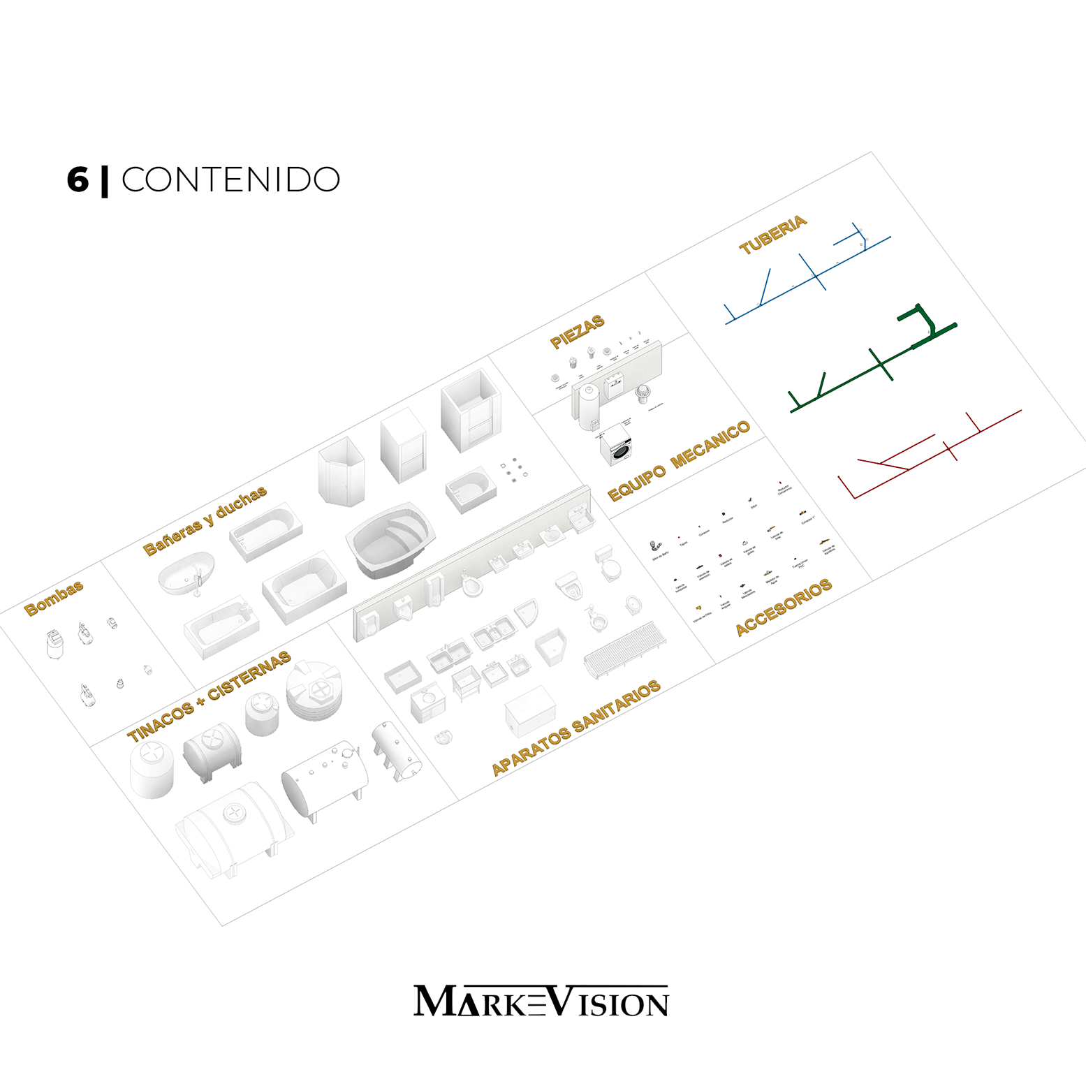 Incluve configuraciones de vistas, plantillas de vista y un catálogo completo de familias: bombas, bañeras, duchas, tinacos, cisternas, aparatos sanitarios, accesorios para tubería, piezas especiales y tuberías. La parametría permite adaptar cada elemento a tu proyecto sin perder tiempo.